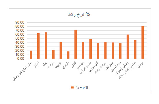 – کمترین میزان در رشته پول و سایر غیرزندگی: این رشته ها به ترتیب با نرخ رشد ۳۴.۱۸٪ و ۲۲.۰۷٪ کمترین میزان خسارت را داشته اند.